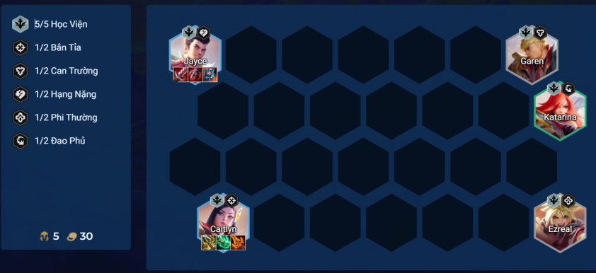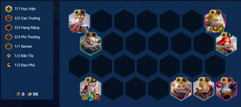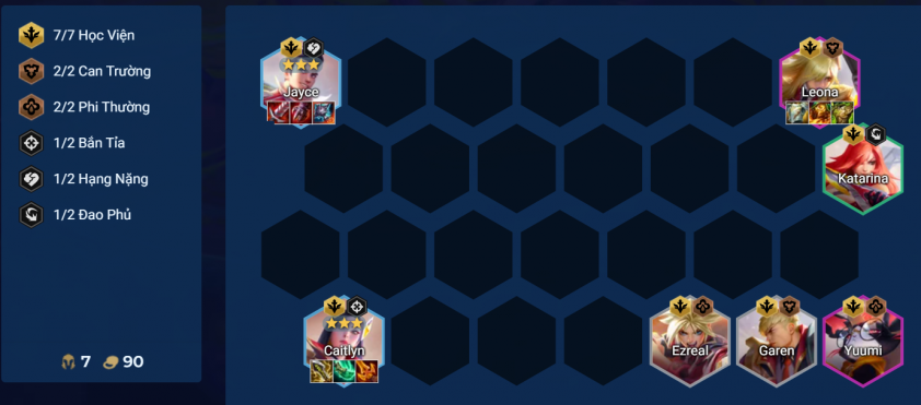 Đội hình reroll ở cấp 7 nên thường roll thêm được cả Caitlyn và Katarina 3 sao. Chốt bài ngay khi có tạo tác Chùy Bạch Ngân cho Jayce.