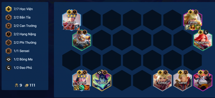 Bắt đầu giao tranh: Các tướng Học Viện đã Thức Tỉnh và đồng minh liền kề với mỗi tướng này nhận 70 Máu, 8% SMCK và 8% SMPT. Các tướng Học Viện nhận gấp đôi. Nhận 1 Katarina.