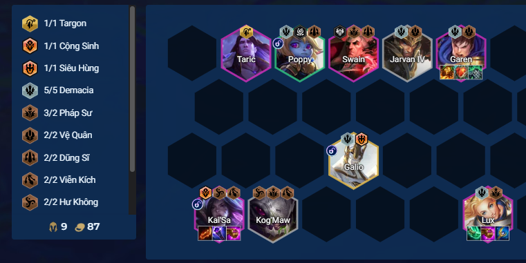 - Sau khi mở khóa được Galio, bán bớt Demacia đi thay bằng các tướng 4-5 vàng chất lượng như Taric - Swain