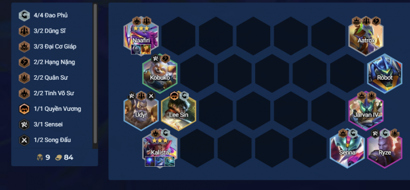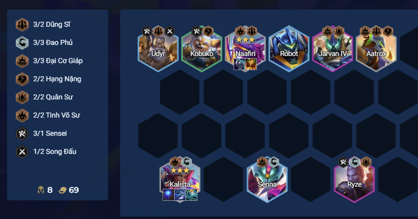 Reroll ở cấp 5 nâng Kalista lên 3 sao. Aatrox 3 sao hoặc Naafiri 3 sao có thể dùng làm tanker chính. Tất nhiên, nếu Kobuko cống hiến và nâng lên được 3 sao thì chẳng tội gì mà không dùng luôn tanker mạnh nhất meta này.