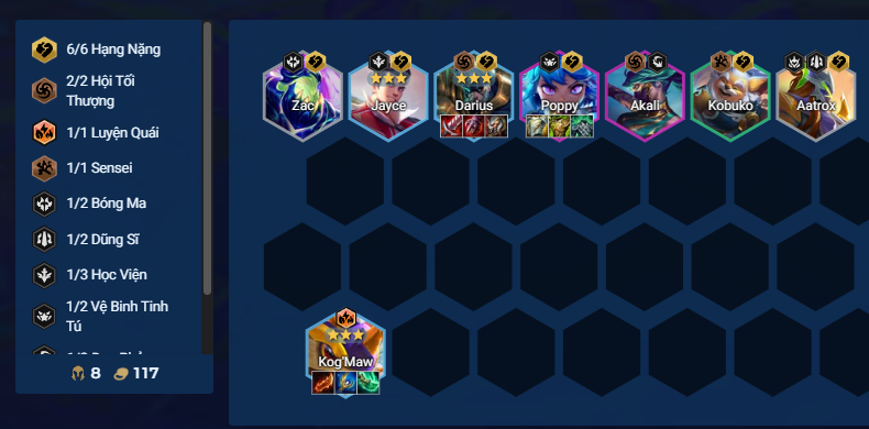 Bên cạnh Hộ Vệ và Dũng Sĩ, Hạng Nặng cũng là dàn tank vô cùng hiệu quả cho Kog'Maw. Tất nhiên, đi cùng Sâu Róm trong đội hình Hạng Nặng thì không thể thiếu Darius, một chủ lực hiệu quả cùng mức giá 3 tiền và reroll ở cấp 7.