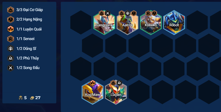 Chỉ chơi khi có Lulu sớm. Nhanh chóng đặt Lulu vào sân và chọn triệu hồi Kog'Maw. Reroll ở cấp 7 để nâng Kog'Maw và Darius lên 3 sao.