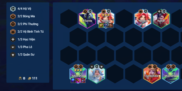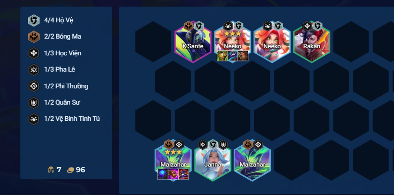 Chỉ chơi khi có lõi công nghệ Cặp Đôi Hoàn Cảnh. Reroll ở cấp 7 nâng Malzahar - Neeko lên 3 sao, đi kèm với Hộ Vệ để tank.