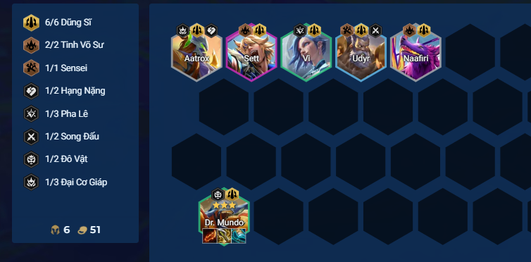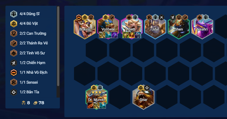 Chỉ chơi đội hình này khi có nâng cấp Cho Chúng Nếm Mùi Ghế ở đầu trận. Reroll Mundo lên 3 sao ở cấp 6. Carry phụ dùng Volibear hoặc Braum tùy tướng nào ra trước, Sett là tanker hàng trên.