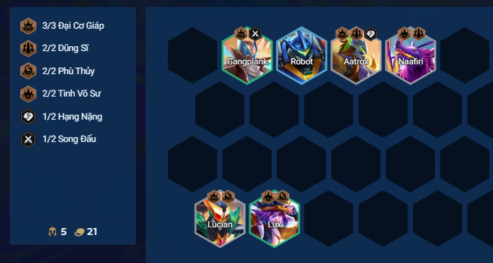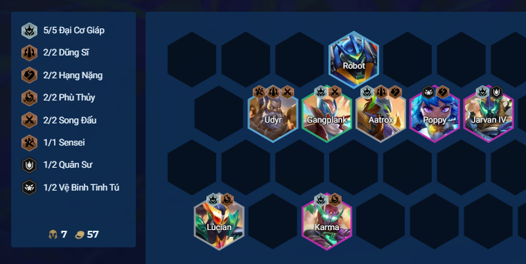 Phi Công Chiến Giáp là thức tỉnh dành riêng cho Đại Cơ Giáp. Bạn có thể dùng thức tỉnh này lên Jarvan IV, Gangplank, Aatrox và Senna để buff cho Robot. Đây là một đội hình rất hot trong phiên bản 15.7.