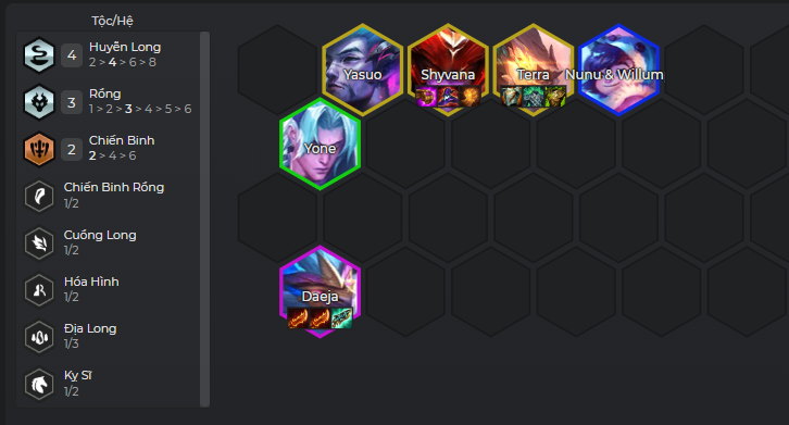 Đội hình 3 Rồng với chủ lựa Daeja đang được xếp ở bậc A trong phiên bản 15.7, thuộc dạng có thể chơi được. Nên chốt ngay nếu có Daeja, Terra và Shyvana sớm.