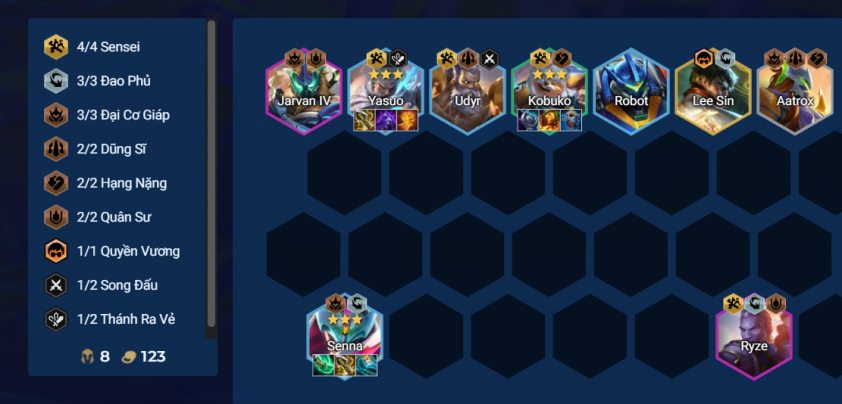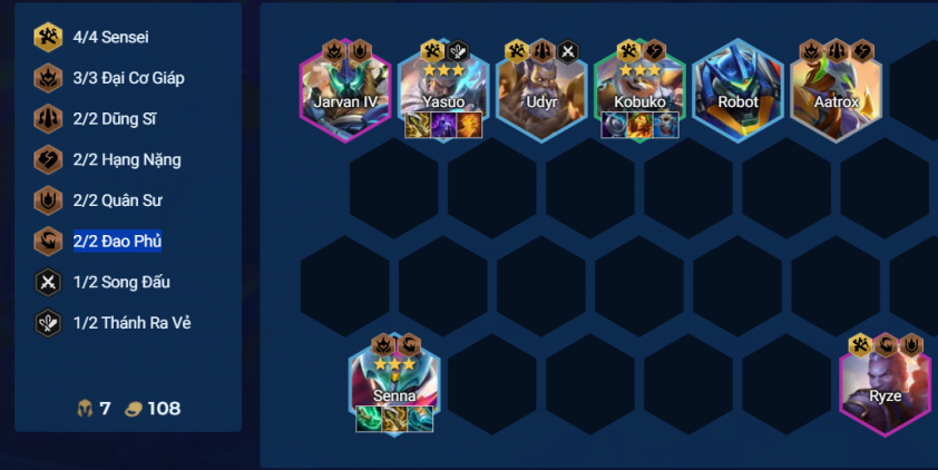 Đội hình reroll ở cấp 7 nâng Senna và Yasuo lên 3 sao. Đánh xoay quanh Đao Phủ và 4 Sensei. Lưu ý chỉ đặt đúng 1 hoặc đúng 4 Sensei lên sân. Mạnh từ phiên bản DTCL 15.3.
