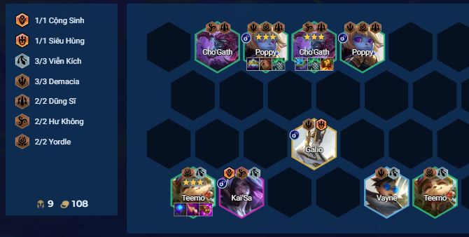 - 2 Poppy + Vayne 2 sao đã là 7 cấp sao Demacia, ở round quái lắp thêm 5 tướng Demacia nữa mở khóa ngay được Galio
