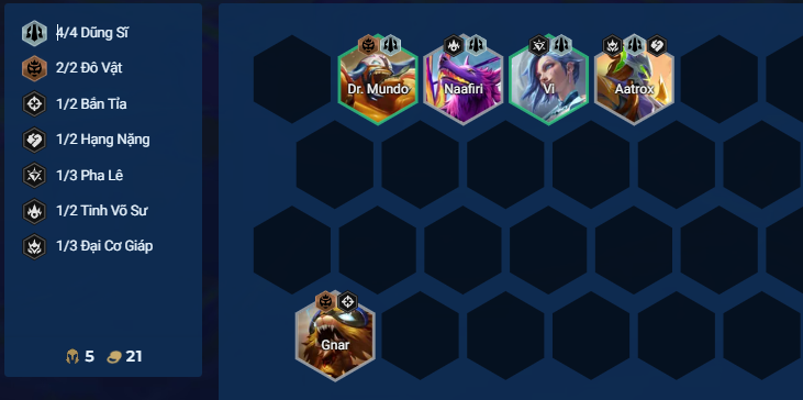 - Form Gnar kẹp Dũng Sĩ đang cực kỳ mạnh ở đầu trận nếu bạn có trang bị tốc độ đánh cho Gnar, có thể chuỗi thắng đến hết Stage 3 và farm vài chục vàng với Ngón Đòn Hoàng Kim