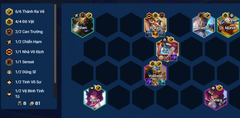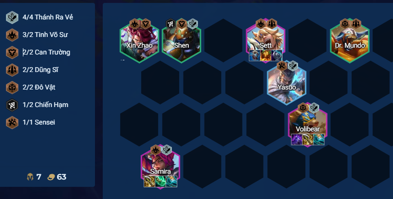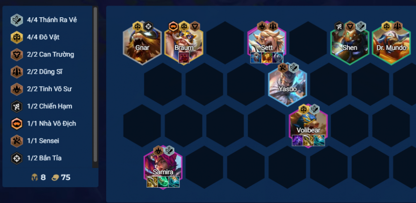 - Thứ tự ưu tiên trang bị: Volibear >>> Braum / Sett >>> Samira / Yone