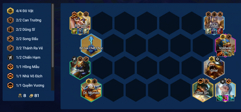 - Thứ tự ưu tiên trang bị: Volibear >>> Udyr >>> Zyra / Lee Sin