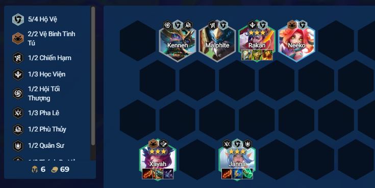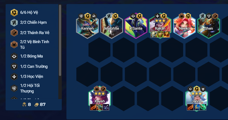 Reroll ở cấp 6 nâng Rakan - Xayah lên 3 sao. Nếu đội hình quá yếu ở cấp 6, đẩy thẳng lên cấp 7 để roll và quản lý HP dễ dàng hơn. Janan 3 sao sẽ là tướng hộ công vô cùng hiệu quả.