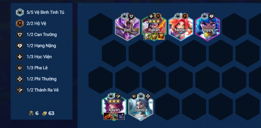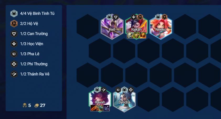 Chỉ chơi khi có trái ác quỷ Fan Service. Reroll ở cấp 6 nâng Rakan - Xayah lên 3 sao, sau đó lắp vào bộ khung Vệ Binh Tinh Tú để tối đa hóa sát thương.
