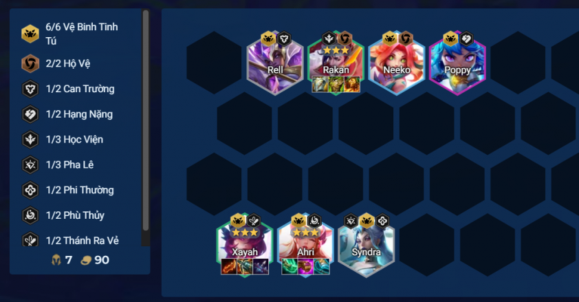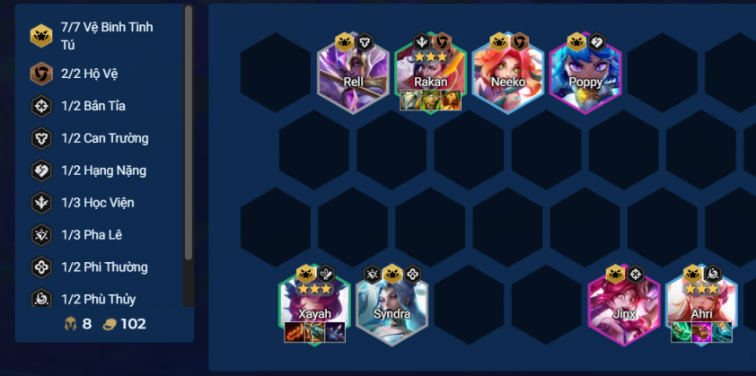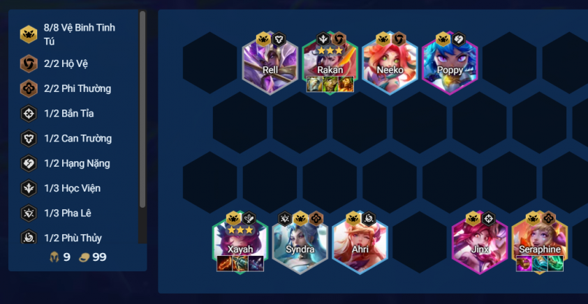 - Thứ tự ưu tiên trang bị: Xayah >>> Rakan >>> Seraphine / Ahri 3 sao