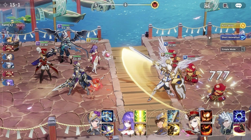 Game tái hiện hệ thống chiến đấu theo lượt đặc trưng, nơi người chơi cần thiết lập đội hình và sắp xếp thứ tự kỹ năng một cách chiến lược. Chỉ với vài thao tác đơn giản, bạn có thể ngồi thư giãn và thưởng thức những trận chiến đẹp mắt mà vẫn đầy tính toán. Các kỹ năng được thể hiện bằng hiệu ứng sống động, từ những chiêu thức rực rỡ như Lunar Slash cho đến Meteor Wrecker hùng vĩ, khiến mỗi trận đấu trở thành một bữa tiệc hình ảnh.