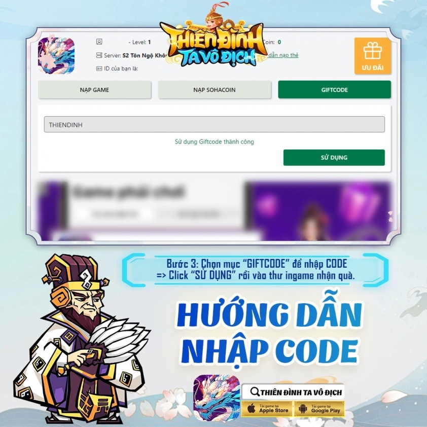 Bước 3: Vào phần GIFTCODE, sau đó nhập code Thiên Đình Ta Vô Địch và ấn SỬ DỤNG.