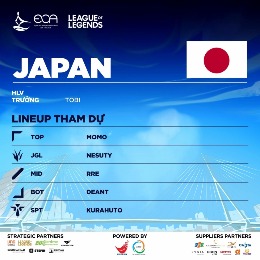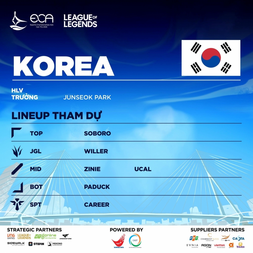 Tối ngày 14/11, ban tổ chức giải vô địch Esports châu Á (ECA 2025) đã chính thức công bố danh sách 5 đội tuyển sẽ góp mặt ở bộ môn LMHT. Hàn Quốc và Trung Quốc cử các tài năng trẻ ở giải hạng 2, trong khi Việt Nam đem ra đội hình mạnh nhất với những siêu sao đang thi đấu tại LCP. Với dàn lực lượng này, Việt Nam gần như đã cầm chắc trong tay tấm huy chương vàng.