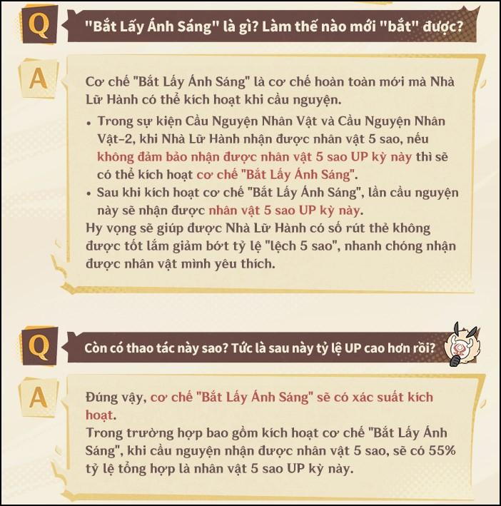 Trong phiên bản 5.0, Genshin Impact sẽ bổ sung cơ chế mới mang tên "Bắt Lấy Ánh Sáng". Nói một cách đơn giản nhất, tỷ lệ ra nhân vật 5 sao ưng ý trong banner thường tăng từ 50 lên 55%.