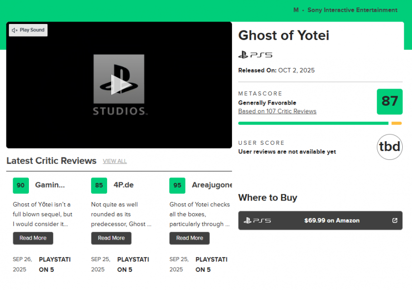 Studio Sucker Punch có lẽ đang mở tiệc ăn mừng khi tựa game mới Ghost of Yotei được giới phê bình đánh giá cực cao, thậm chí vượt trội so với người tiền nhiệm Ghost of Tsushima (2020). Chỉ sau vài ngày ra mắt, trò chơi đã ghi nhận 87 điểm trên Metacritic và 89 điểm trên OpenCritic, so với mốc 83 - 84 điểm của phần game trước.