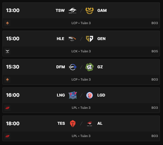 Ở LPL, hai trận đấu đáng chú ý là LNG Esports vs LGD Gaming và Top Esports vs Anyone's Legend. LNG đang dẫn đầu bảng B với thành tích 4 thắng – 0 thua, trong khi LGD mới chỉ có 2 thắng – 2 thua, khiến khoảng cách giữa hai đội là khá rõ ràng. Ở cặp đấu còn lại, Top Esports hiện đứng thứ 5 nhóm S với 3 thắng – 5 thua, trong khi Anyone’s Legend vẫn nằm trong nhóm đầu. Do đó, TES cần điểm số để cải thiện vị trí nếu muốn nuôi hy vọng đi tiếp.
