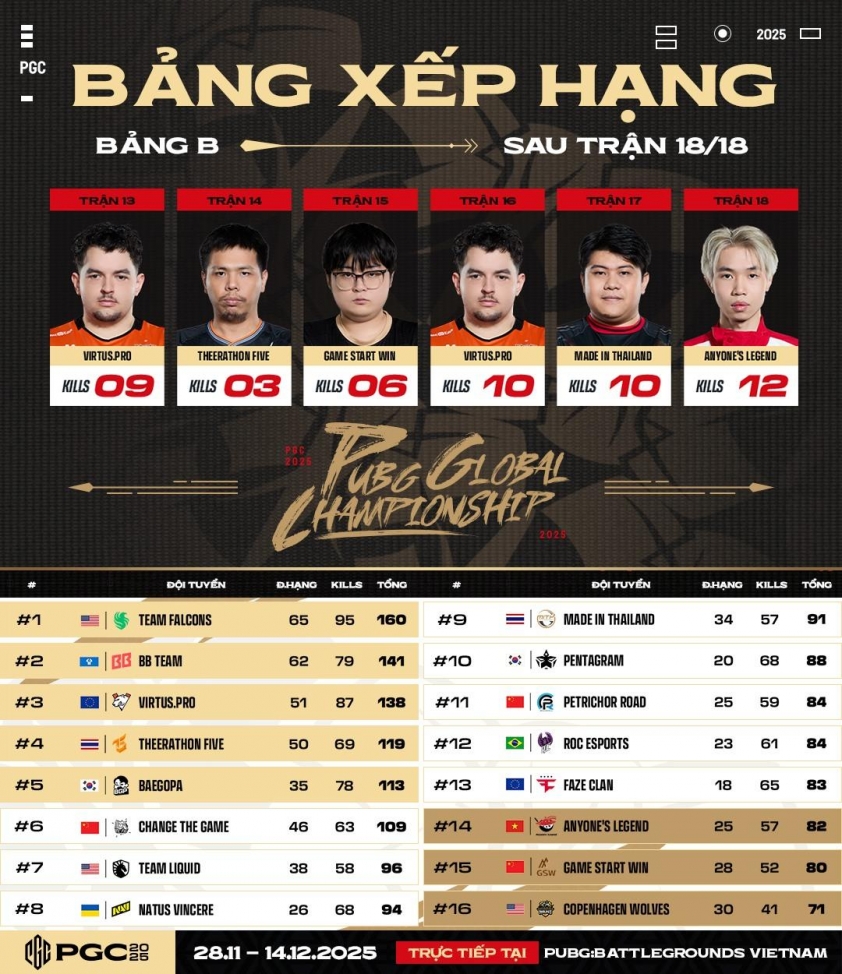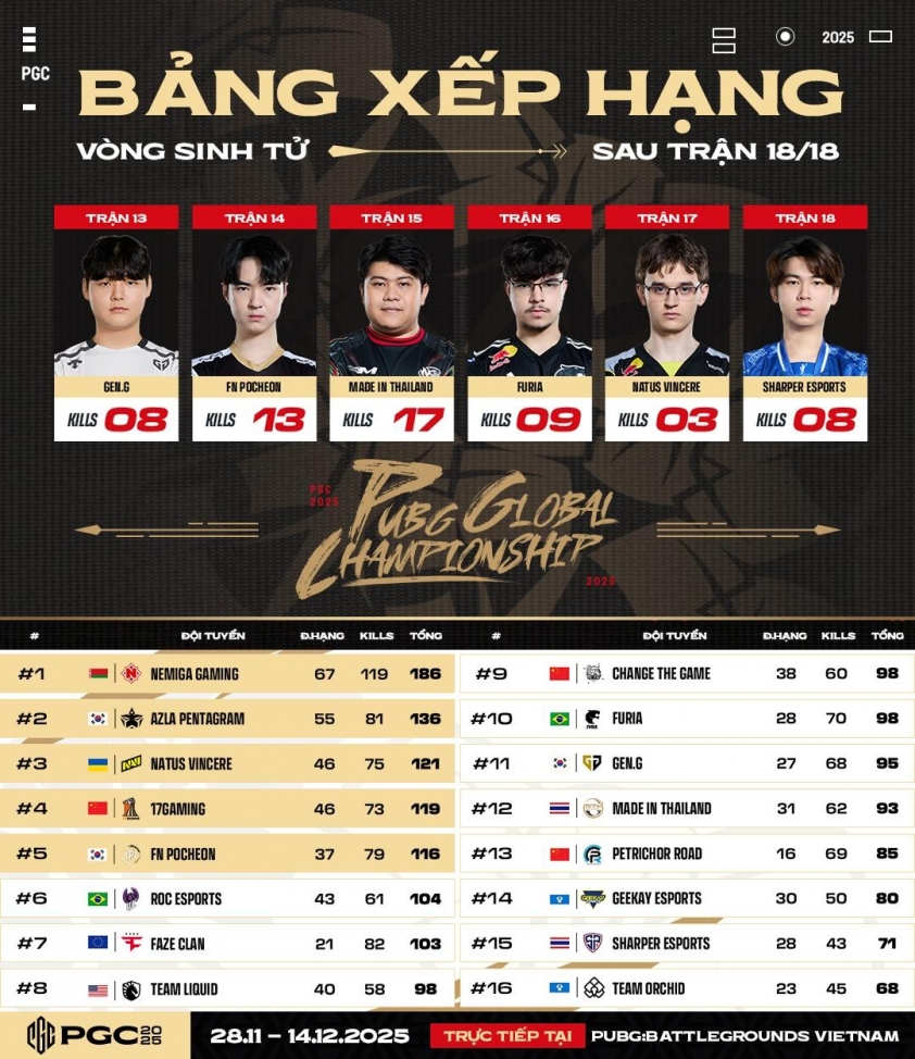 Lịch thi đấu PGC 2025 - giải vô địch thế giới bộ môn PUBG diễn ra từ ngày 28/11 - 14/12 tại Bangkok, Thái Lan.