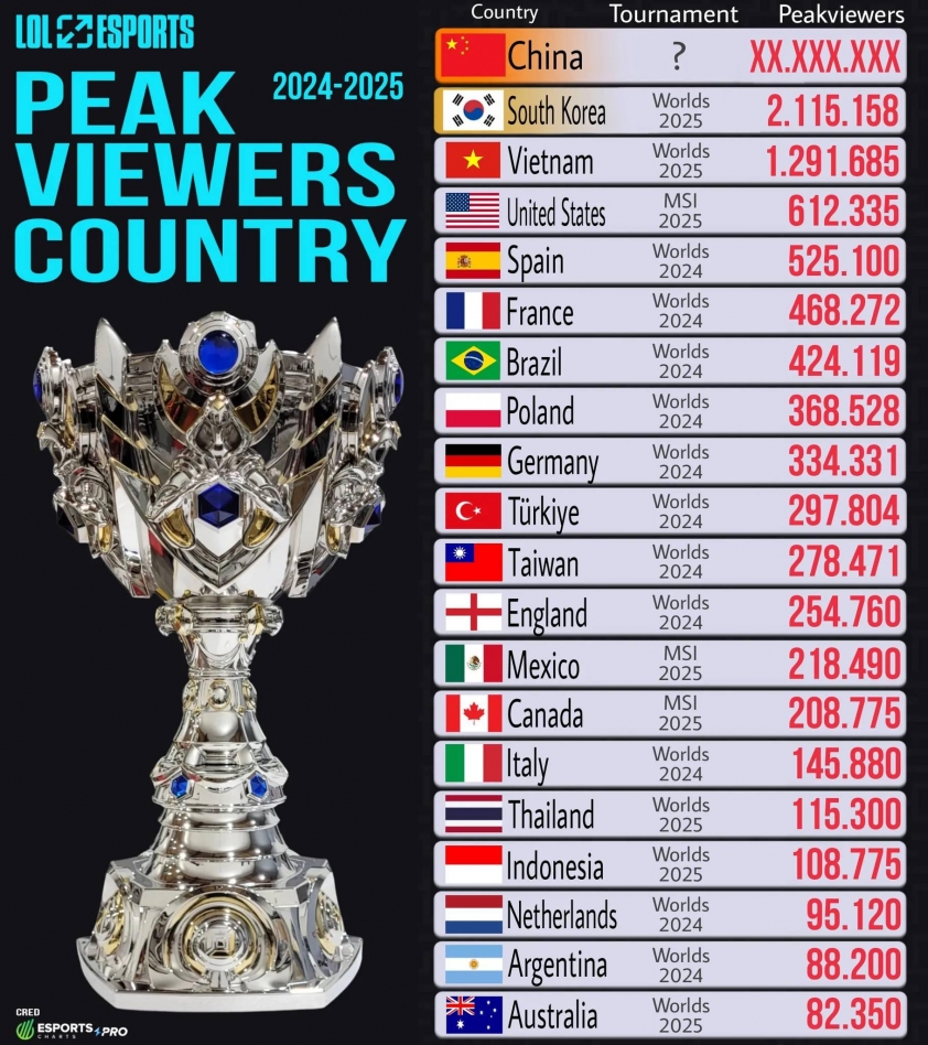 Theo bảng xếp hạng, Việt Nam đạt đỉnh 1.291.685 người xem cùng thời điểm tại Chung Kết Thế Giới 2025. Con số này chỉ xếp sau Hàn Quốc – quốc gia đứng đầu với hơn 2,1 triệu peak viewers – và vượt qua hàng loạt thị trường lâu đời, đông đảo người hâm mộ LMHT như Mỹ, Tây Ban Nha, Pháp hay Brazil. Đây là lần hiếm hoi Việt Nam sánh vai trực tiếp với Hàn Quốc ở một chỉ số mang tính toàn cầu của LoL Esports.