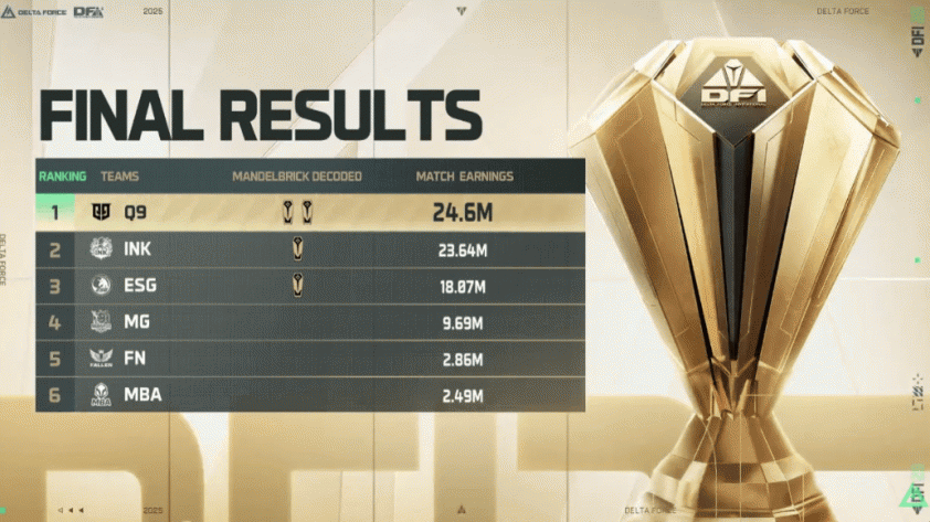 Round 6 trở thành bước ngoặt: Q9 tận dụng vị trí thuận lợi, hoàn tất giải mã Mandelbrick và khóa chặt chiến thắng, chính thức lên ngôi vô địch Delta Force Invitational 2025. Chung cuộc, Q9 giành ngôi quán quân, INK xếp hạng 2 và ESG cán đích ở vị trí thứ 3.