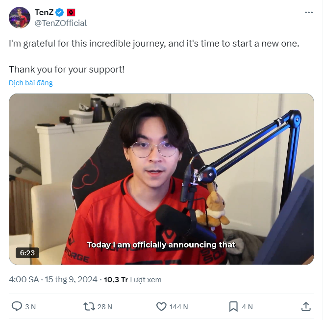 Ngày 15/09 vừa qua, Tyson "TenZ" Ngo - siêu sao gốc Việt của bộ môn VALORANT đã thông báo sẽ chính thức giải nghệ. Anh cho biết đã lên kế hoạch cho việc nghỉ thi đấu kể từ đầu năm và nói với đồng đội ngay trước thềm giải đấu VCT Champions 2024.