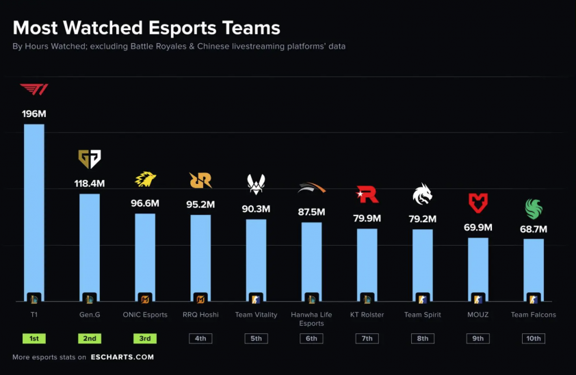 Bảng xếp hạng của Esports Charts, không tính dữ liệu từ Trung Quốc và các tựa game battle royale, phản ánh rõ giá trị thương hiệu vượt ngoài khuôn khổ thành tích thuần túy. Với sức hút bền bỉ, lượng người hâm mộ đông đảo và hình ảnh biểu tượng gắn liền với Faker, T1 tiếp tục là cái tên không có đối thủ về độ phổ biến, đồng thời thiết lập chuẩn mực mới cho sự thống trị trong Esports hiện đại.