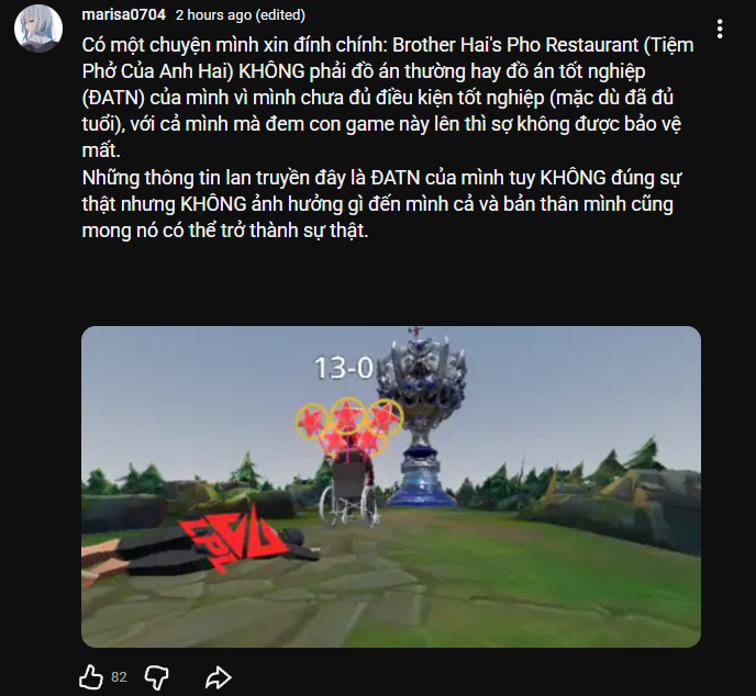 Cộng đồng game thủ vẫn đang bày tỏ sự ủng hộ mạnh mẽ dành cho tựa game cây nhà lá vườn của Marisa. Nhiều người cho rằng dù không phải đồ án tốt nghiệp, Brother Hai’s Pho Restaurant vẫn là minh chứng rõ nét cho tiềm năng sáng tạo của các nhà phát triển game trẻ của Việt Nam, tạo nên câu chuyện truyền cảm hứng khi một “bát phở nóng hổi” cũng có thể trở thành khởi đầu cho một tựa game quốc dân được nhà nhà yêu thích.