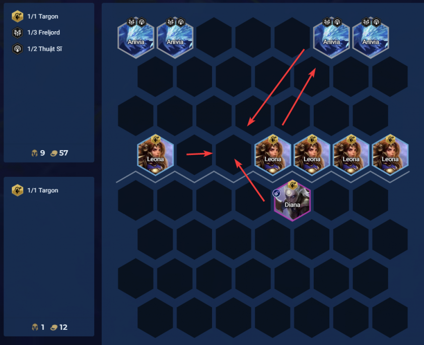 Với cách đặt tướng tiêu chuẩn, Diana thường nhắm thẳng vào carry được đặt ở góc bàn cờ hoặc những vị trí quen thuộc của các đội hình đánh xa. Đây cũng là lý do khiến nhiều người chơi cảm giác Diana ‘quá mạnh’, trong khi thực tế phần lớn sát thương đến từ việc cô luôn tìm được góc lao vào lý tưởng.