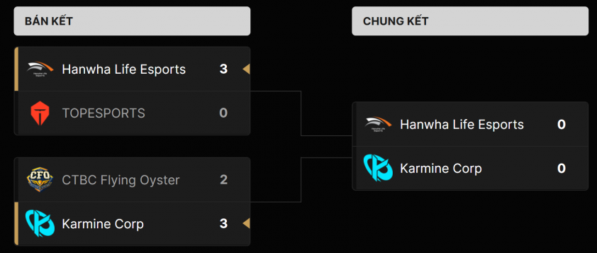 Ở cặp Bo5 đầu tiên, CFO của Đài Bắc Trung Hoa chạm trán với KC của Châu Âu. Ngay sau đó, HLE của Hàn Quốc sẽ đụng độ với TES của Trung Quốc.