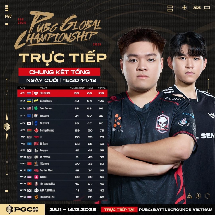 Trận chung kết PGC 2025 sẽ diễn ra vào lúc 16h30 ngày 14/12 (theo giờ Việt Nam). Trận đấu sẽ được phát sóng trực tiếp trên các kênh sóng của PUBG: BATTLEGROUNDS VIETNAM.