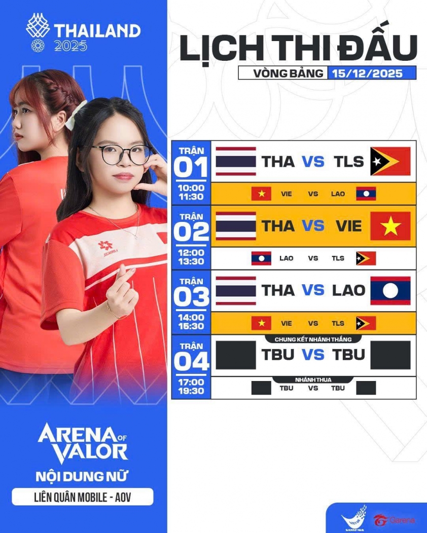 Trong ngày 15/12, các cô gái của Liên Quân Mobile Việt Nam sẽ có 3 trận đấu quan trọng ở vòng bảng với Lào, Thái Lan và Đông Timor lần lượt vào 10h00, 12h00 và 14h00.