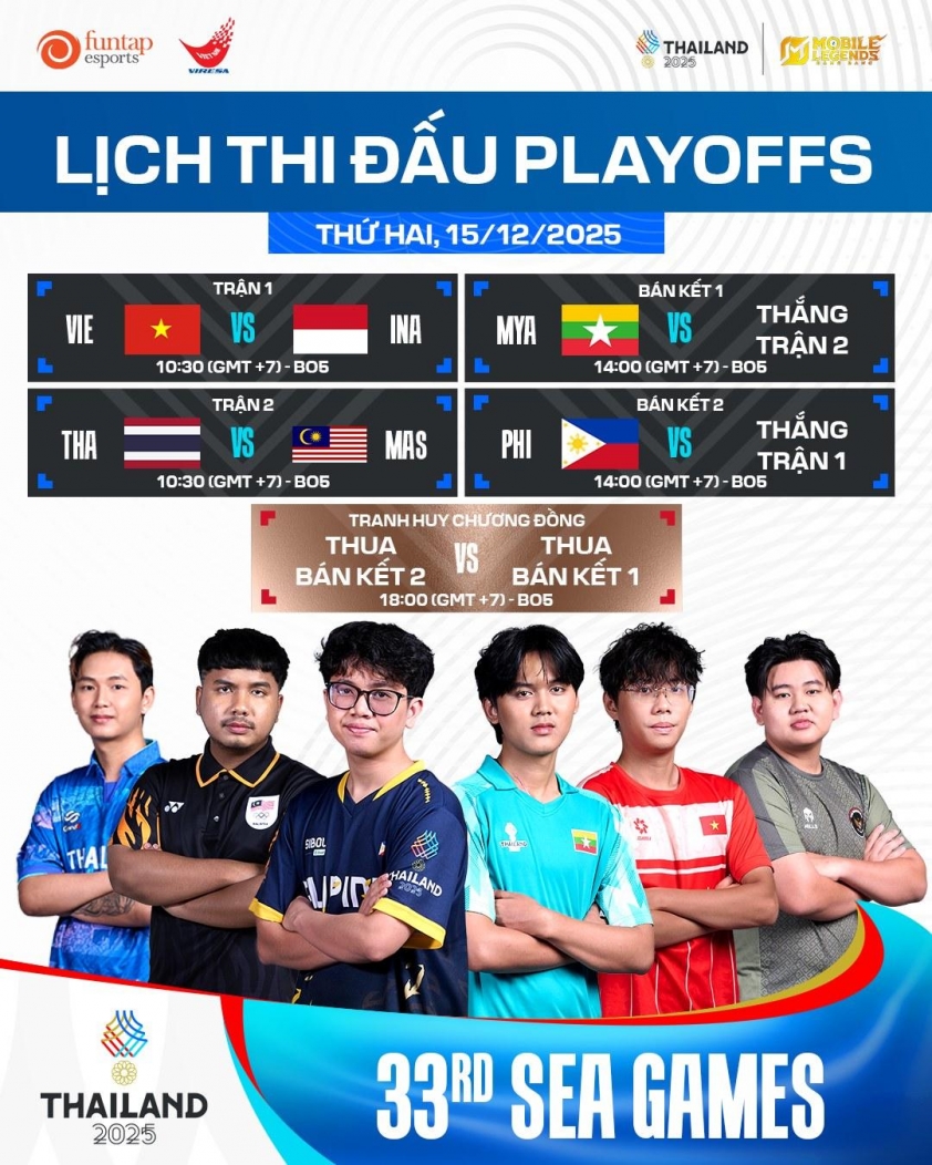 Trong ngày 15/12, bộ môn Mobile Legends: Bang Bang - Đồng Đội Nam tại SEA Games 33 sẽ thi đấu vòng chung kết với 4 trận đấu. Việt Nam gặp Indonesia vào lúc 10h30. Nếu chiến thắng, chúng ta sẽ tiếp tục chạm trán với Philippines vào lúc 14h00 chiều.