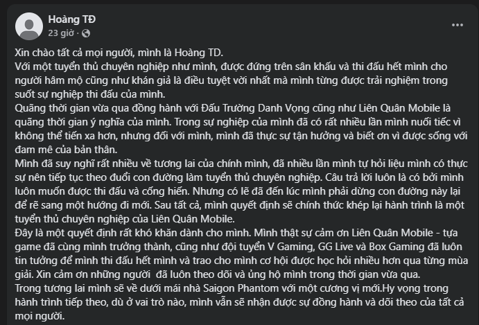 Trong bài chia sẻ của mình, Hoàng TĐ thẳng thắn nhìn lại chặng đường đã qua, nhắc đến những khoảnh khắc đáng nhớ xen lẫn nuối tiếc vì chưa thể tiến xa hơn như kỳ vọng. Anh thừa nhận quyết định giải nghệ không hề dễ dàng, được đưa ra sau rất nhiều lần tự vấn bản thân về động lực, khát khao và khả năng tiếp tục theo đuổi con đường tuyển thủ chuyên nghiệp. “Sau tất cả, mình quyết định sẽ chính thức khép lại hành trình là một tuyển thủ chuyên nghiệp của Liên Quân Mobile”, Hoàng TĐ viết, với giọng điệu dứt khoát nhưng đầy cảm xúc.