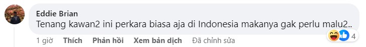 Trong đó, CĐV Eddie Brian cho rằng: "Bình tĩnh đi các bạn, đây là điều bình thường ở Indonesia nên không phải xấu hổ đâu...".