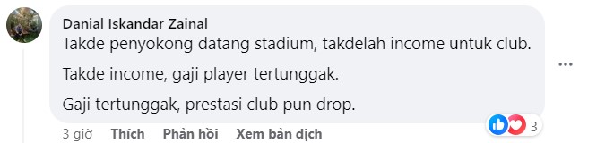 CĐV Danial Iskandar Zainal chỉ ra hệ lụy của án phạt đối với CLB: "Không có khán giả đến SVĐ thì không có thu nhập cho CLB. Không có thu nhập, cầu thủ phải chờ lương. Mà chậm lương thì hiệu quả thi đấu của đội sẽ giảm".