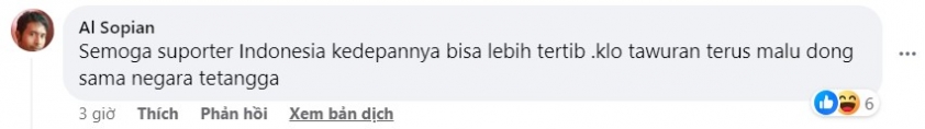 Trong khi đó, CĐV Al Sopian nhắn nhủ: "Hy vọng những NHM bóng đá Indonesia có thể văn minh hơn trong tương lai. Nếu tiếp tục gây hỗn loạn thì thật xấu hổ với nước láng giềng".