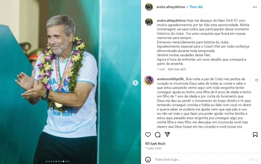 Cụ thể, ông Andre Luiz viết: "Hôm nay, tôi phải nói lời tạm biệt CLB Nam Định. Cảm ơn rất nhiều vì đã cho tôi cơ hội làm việc với đội bóng.