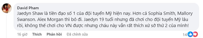 Tài khoản có tên David Pham chỉ ra rằng: "Jaedyn Shaw là tiền đạo số 1 của đội tuyển Mỹ hiện nay. Hơn cả Sophia Smith, Mallory Swanson. Alex Morgan thì bỏ đi.