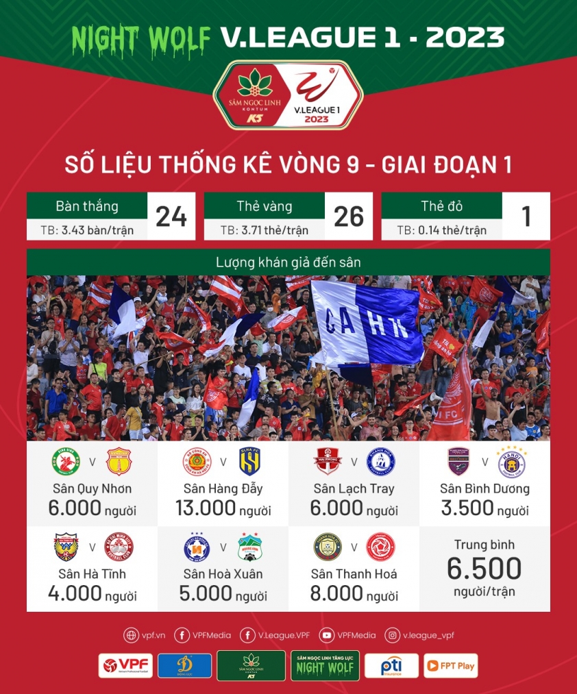 Vòng 9 V-League 2023 không chỉ ghi dấu bởi số lượng khán giả kỷ lục, với tổng cộng 45.500người, đạt con số trung bình 6.500 người/trận, mà còn là một vòng đấu có chất lượng chuyên môn rất cao, với 24 bàn thắng được ghi ở 7 trận đấu, đạt hiệu số 3,43 bàn/trận, và điều đáng nói là không có trận đấu nào kết thúc với tỷ số hòa 0-0.