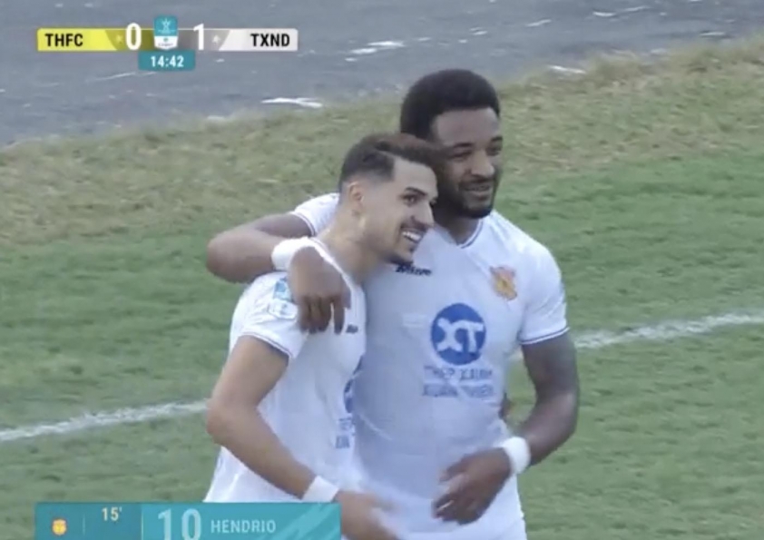 Nhận bóng ngoài vòng cấm, Hendrio tung cú sút chìm hiểm hóc làm bó tay thủ môn Xuân Hoàng, đưa Nam Định vươn lên dẫn trước.