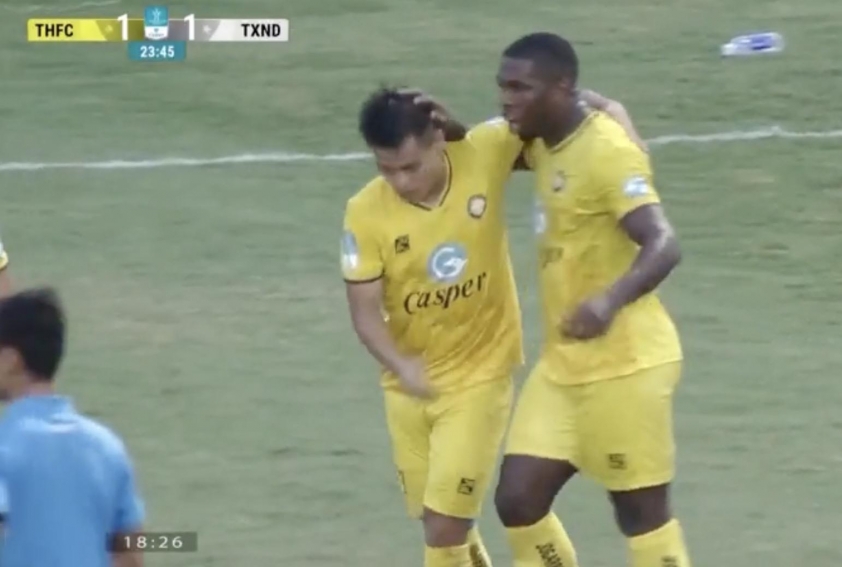 Một pha tấn công trung lộ hay của đội chủ nhà. A Mít băng lên hạ gục Nguyên Mạnh ở pha đối mặt, cân bằng tỷ số 1-1 cho Thanh Hóa.