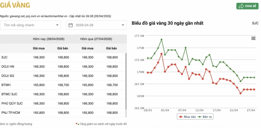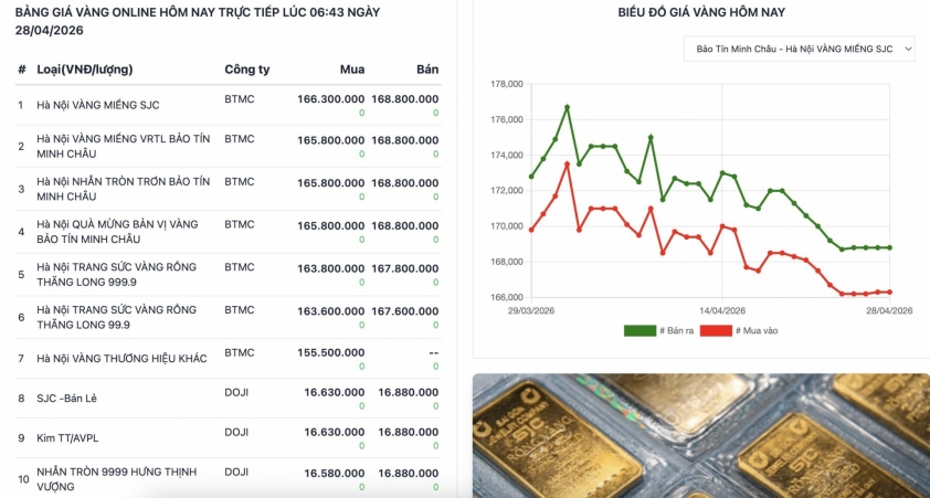 Sáng 28/04, giá vàng trong nước duy trì trạng thái ổn định tại nhiều hệ thống lớn. Vàng miếng SJC được niêm yết ở mức 166,3 triệu đồng/lượng mua vào và 168,8 triệu đồng/lượng bán ra. Cùng mức giá này còn có DOJI Hà Nội, DOJI Sài Gòn, BTMC SJC và Phú Quý SJC. PNJ TP.HCM niêm yết giá mua thấp hơn nhẹ ở mức 165,8 triệu đồng/lượng nhưng giá bán vẫn giữ 168,8 triệu đồng/lượng. Trong khi đó, Bảo Tín Minh Châu ghi nhận mức mua vào 165,8 triệu đồng/lượng và bán ra 168,7 triệu đồng/lượng. Thị trường nhìn chung không có biến động lớn so với phiên trước.
