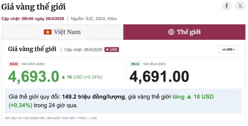 Trên thị trường quốc tế, giá vàng thế giới cập nhật lúc 06h40 ngày 28/04 ghi nhận xu hướng tăng nhẹ. Giá bán (ASK) đạt 4.693,0 USD/ounce, tăng 16 USD, tương đương 0,34% so với 24 giờ trước. Giá mua (BID) hiện ở mức 4.691,00 USD/ounce. Quy đổi theo tỷ giá hiện hành, giá vàng thế giới tương đương khoảng 149,2 triệu đồng/lượng, vẫn thấp hơn đáng kể so với vàng SJC trong nước khoảng gần 20 triệu đồng/lượng. Diễn biến này cho thấy chênh lệch giữa thị trường vàng trong nước và thế giới vẫn duy trì ở mức cao.