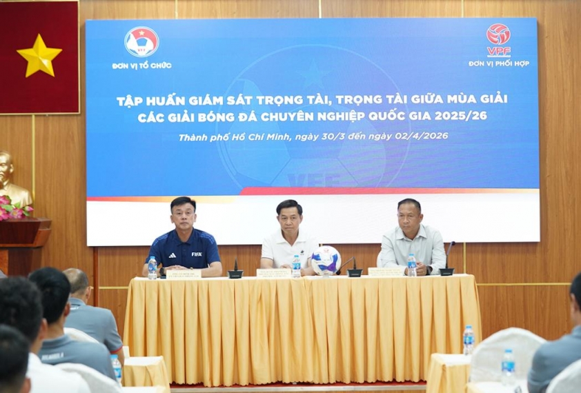 Chiều 30/3, tại Hội trường TDTT Thống Nhất (TP.HCM), LĐBĐVN phối hợp với Công ty Cổ phần Bóng đá Chuyên nghiệp Việt Nam (VPF) tổ chức khai mạc lớp tập huấn đợt 2 giữa mùa giải các giải bóng đá chuyên nghiệp quốc gia 2025/26 dành cho lực lượng giám sát trọng tài, trọng tài.