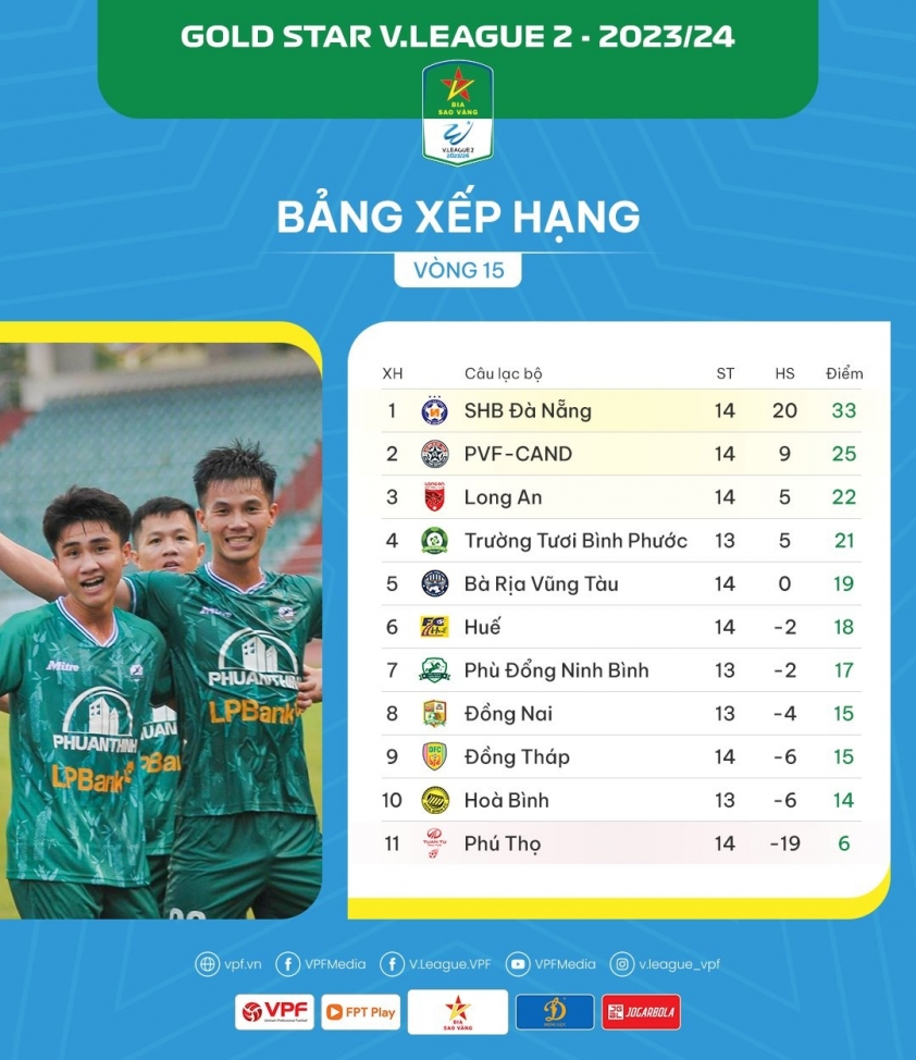 Xếp ngay sau là CLB Long An và CLB Trường Tươi Bình Phước. Cả hai đội bóng này chỉ thua 3-4 điểm so với CLB PVF-CAND. Ở vòng đấu tới, CLB TT Bình Phước sẽ tiếp đón chính CLB PVF-CAND trong trận cầu được đánh giá rất quan trọng trong cuộc đua tranh của hai đội bóng.