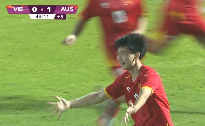 Lê Sỹ Bách bị hậu vệ Australia phạm lỗi trong vòng cấm. Tình huống xoạc không hề trúng bóng nhưng VAR can thiệp và xác định không phải 11m.