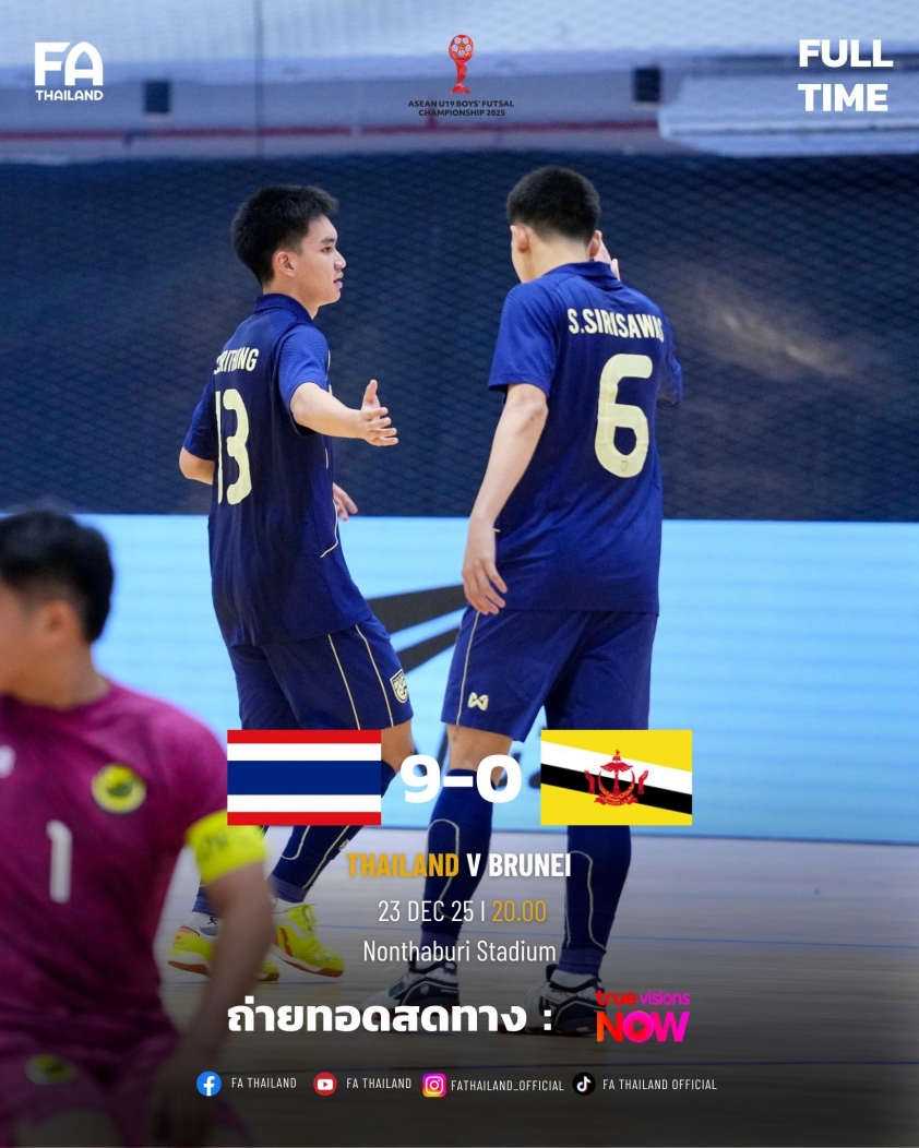 Tối ngày 23/12/2025, đội chủ nhà U19 Futsal Thái Lan đã có màn khởi đầu không thể ấn tượng hơn tại bảng A Giải vô địch Futsal U19 Đông Nam Á 2025. Trước một đối thủ dưới tầm là Brunei, các học trò của HLV Boonlert Charoenwong đã tạo nên một "cơn mưa bàn thắng" với tỷ số cách biệt 9-0 tại nhà thi đấu Nonthaburi.